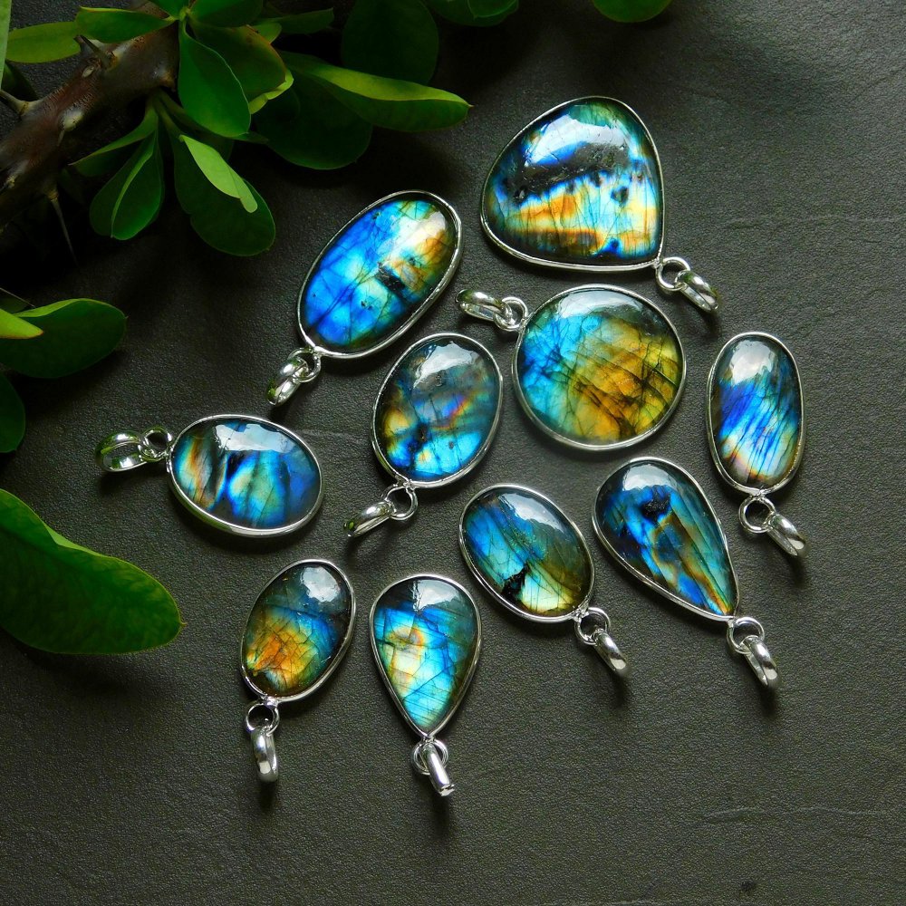 10 Pcs 140 Cts Natural Labradorite Silver Plated Pendant Semi-Precious Healing Crystal Jewelry Lots 16x31-13x24mm #12436