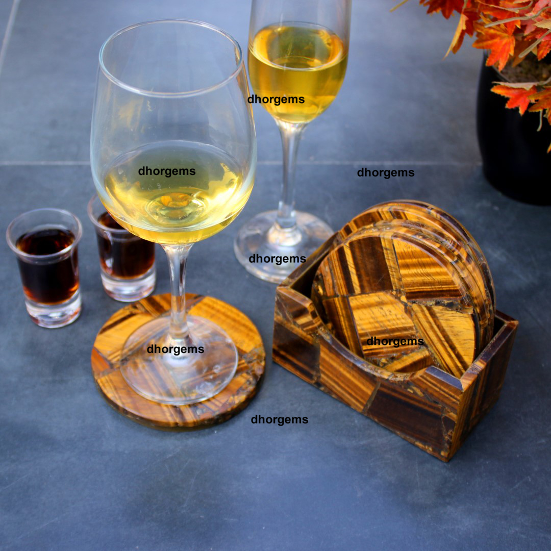 natural Tiger Eye Round coaster set of 6pcs with 1 holder gemstone 4inch coasters for drink